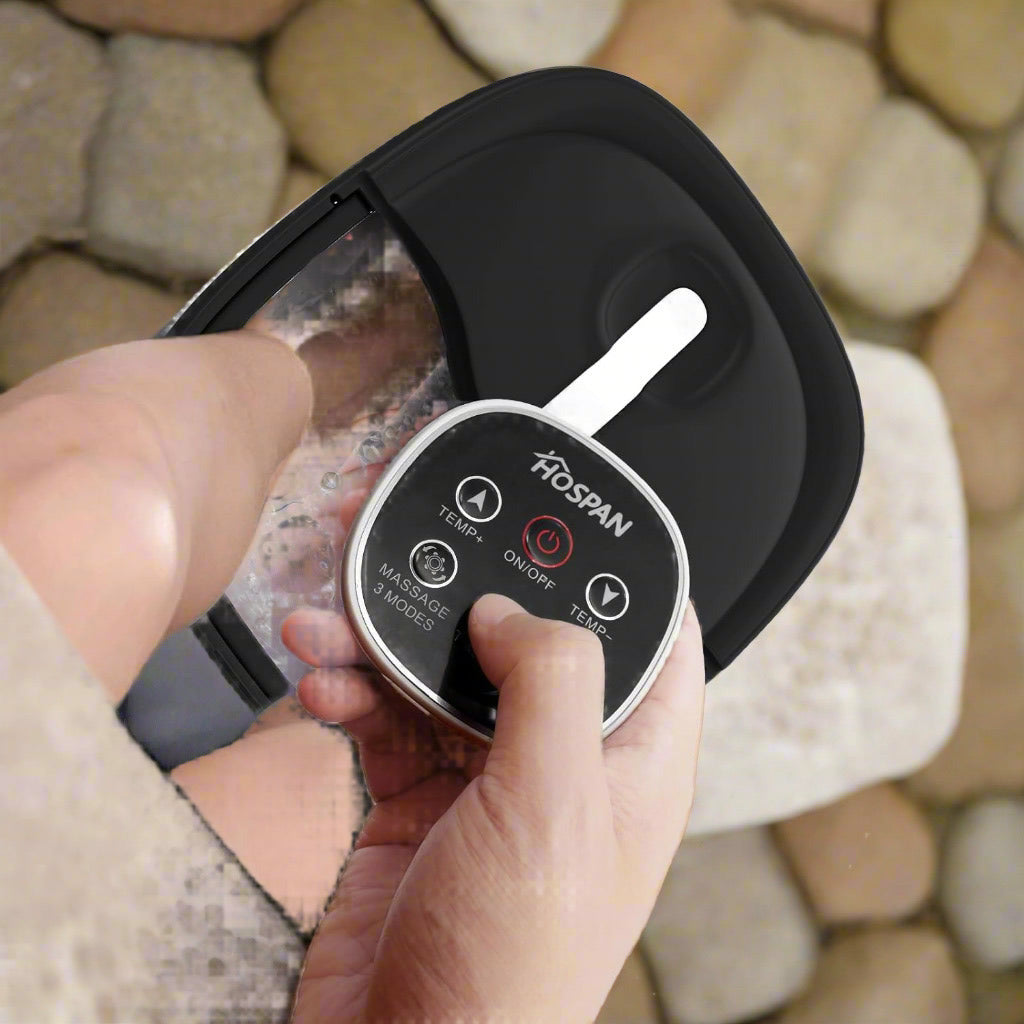 The magnetic remote control is attached to the foot tub. You can also hold it in your hand to control the foot spa without bending over